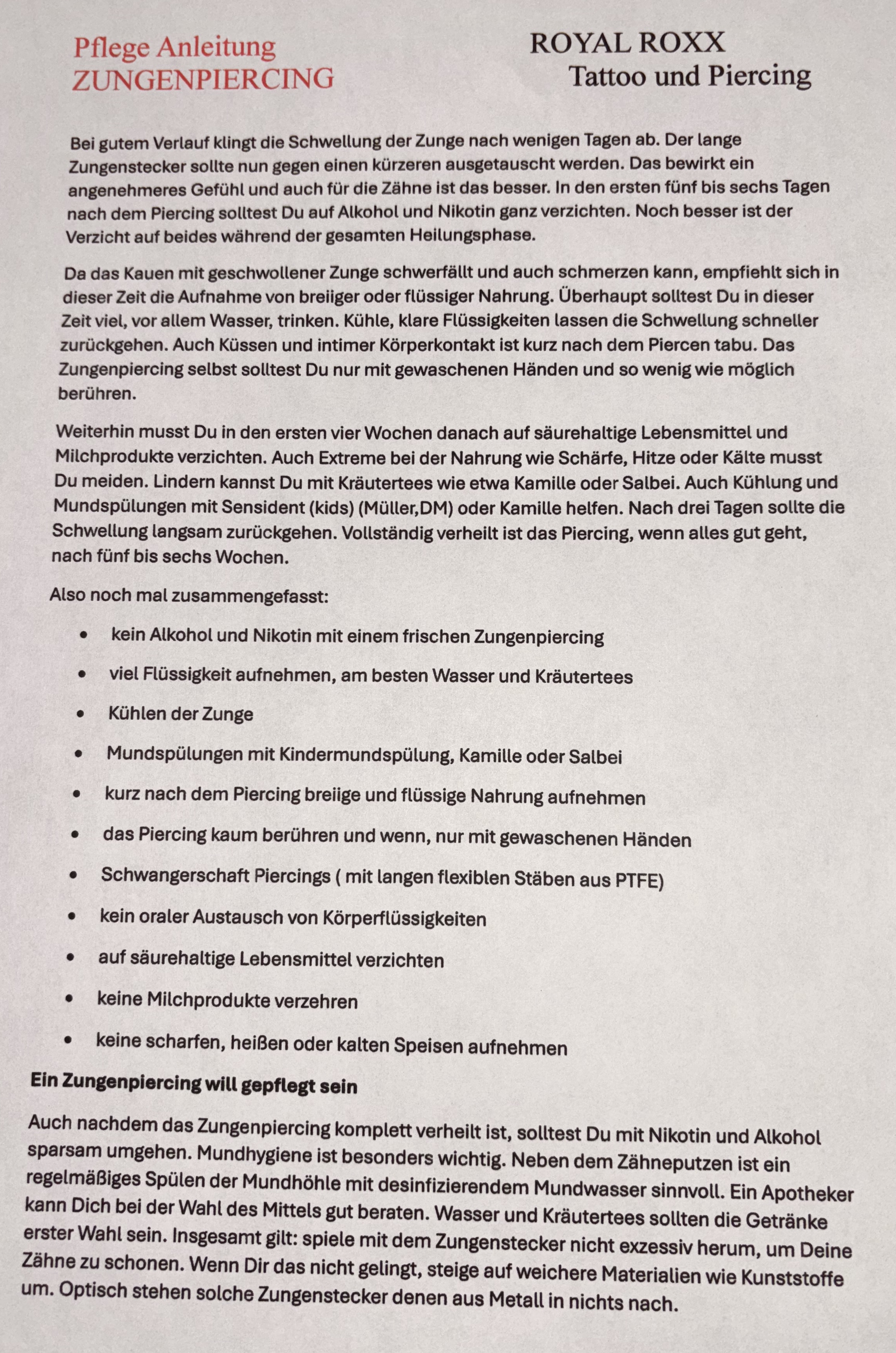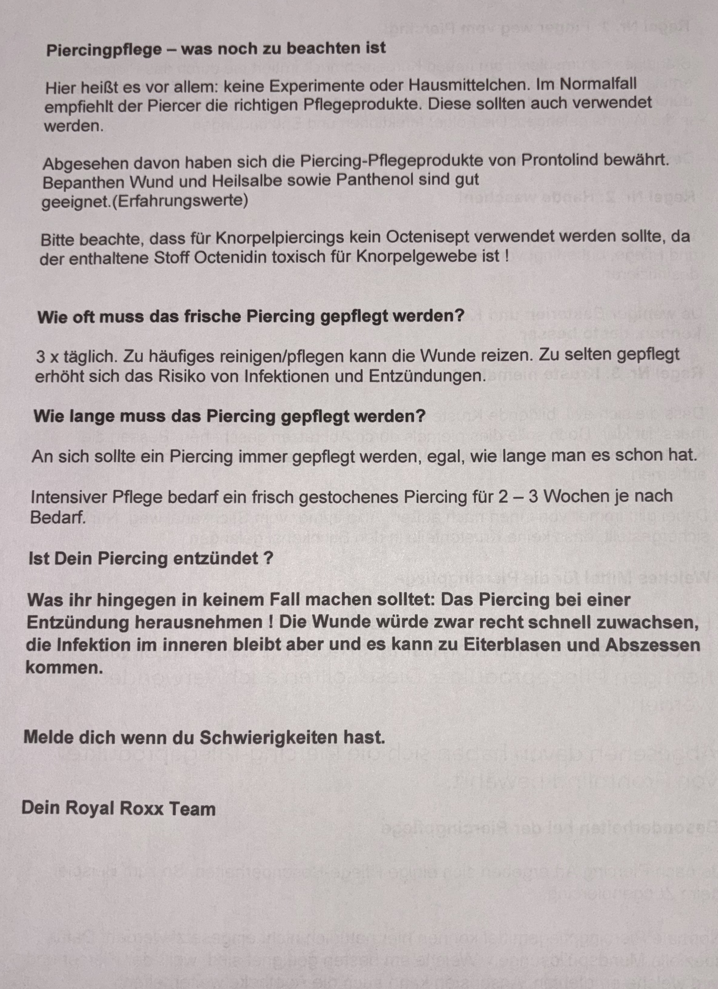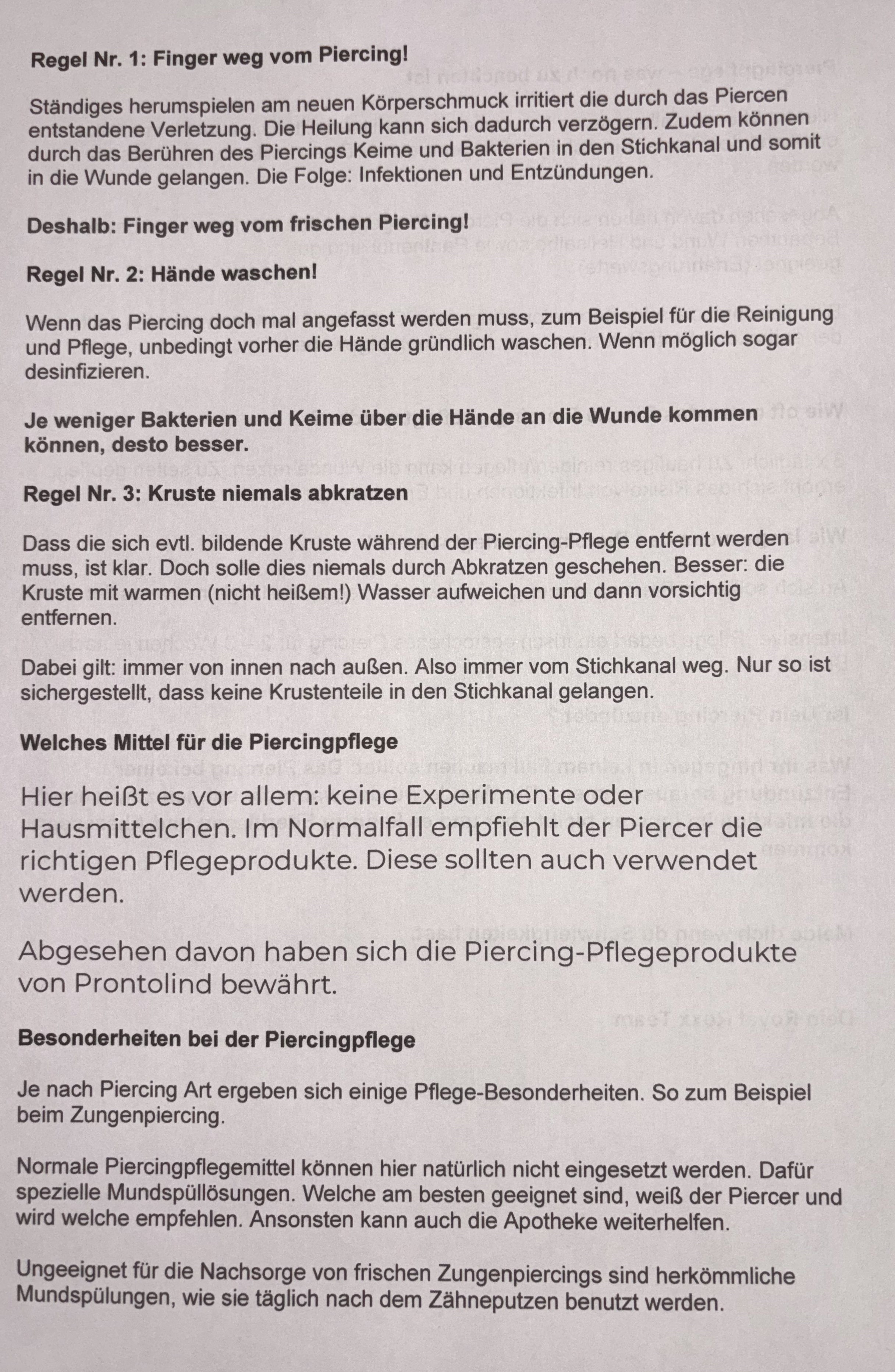 Reinige deine Piercings regelmäßig mit einer milden Seife und Wasser. Vermeide den Kontakt mit Chemikalien und Parfüm und Octenisept!. Trage keine zu enge Kleidung, die Reibung verursachen könnte. Achte darauf, dass dein Piercing gut belüftet ist bei Tierhaaren bitte Pflaster verwenden.